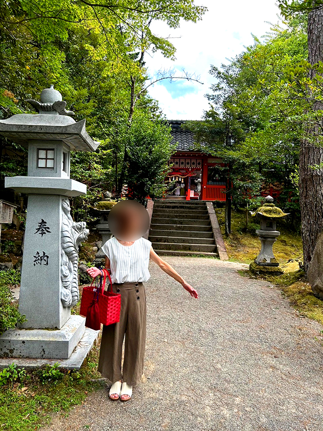 緑に囲まれた鳥居の前で。金沢神社の静かな空気が心地よい場所